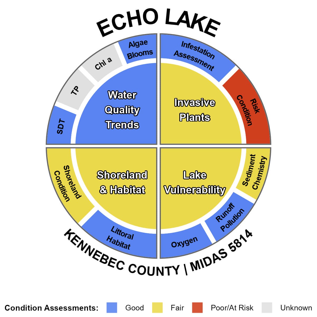 The new Maine DEP Lake Scorecard is now available! This visual summarizes many types of lake data based on the current conditions and trends of each lake’s health. The major categories include water quality trends, invasive plants, shoreland and habitat, and lake vulnerability. You can click on any section to learn more.